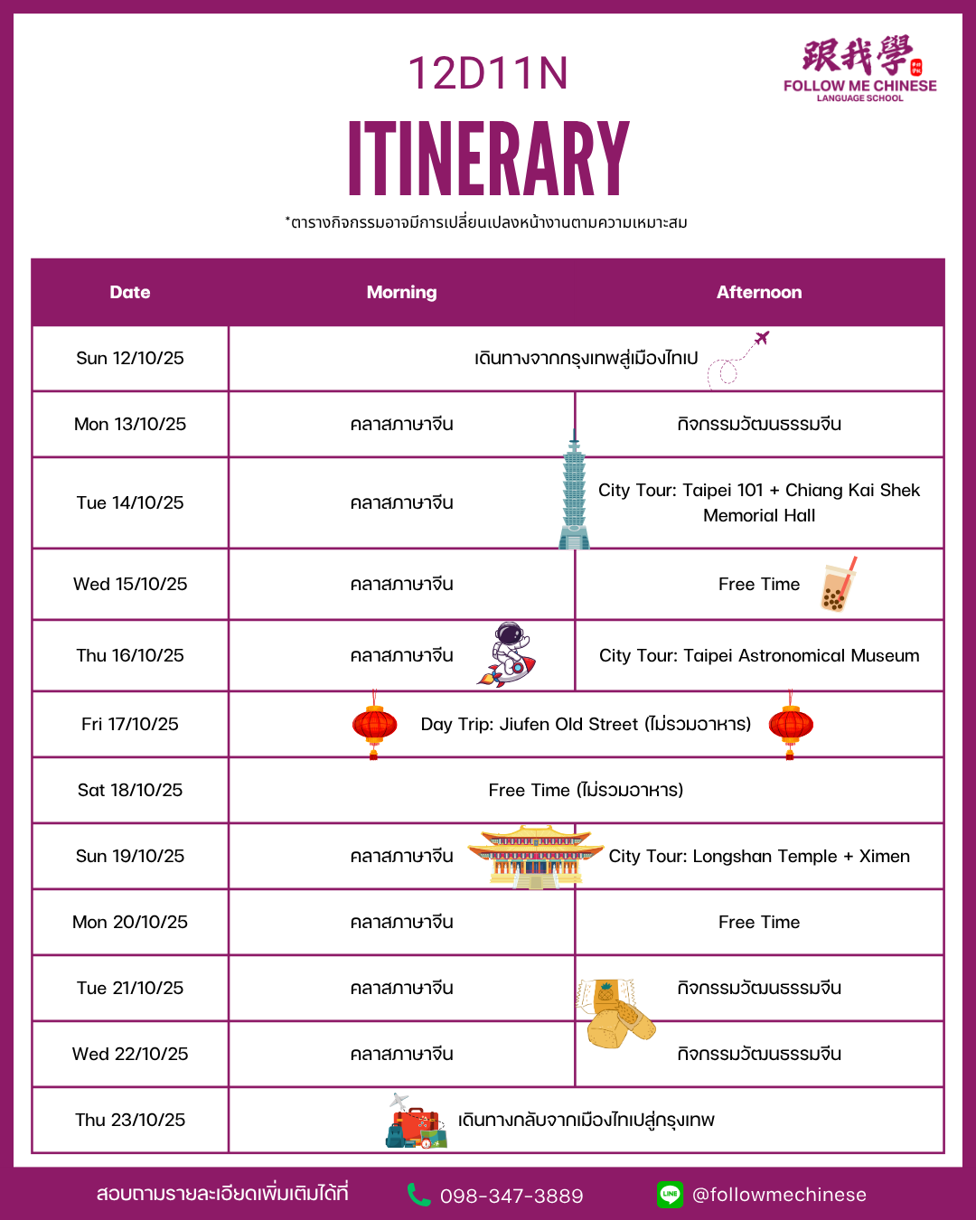 สำหรับ 12-23 ตุลาคม 2568 (12 วัน 11 คืน) ตารางกิจกรรมจะครอบลุม